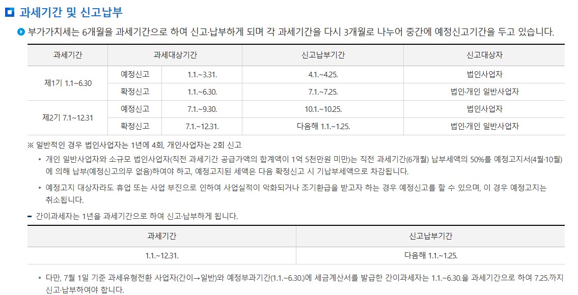 일반과세자의 과세기간은 연 2회로 나뉘며, 1기는 1월부터 6월까지, 2기는 7월부터 12월까지입니다. 각 과세기간 종료 후 한 달 이내인 7월과 다음 해 1월에 부가가치세를 신고하고 납부해야 합니다. 간이과세자는 과세기간이 1년 단위로 적용되며, 다음 해 1월에 한 번만 신고하면 됩니다.