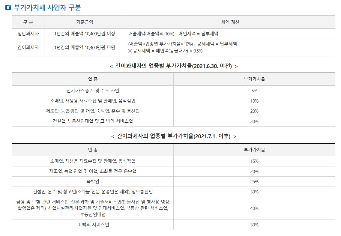 반면, 연매출 1억 400만 원 미만인 개인사업자는 간이과세자로 간주되며, 간단한 신고 방식과 업종별 부가가치율을 적용받습니다. 간이과세자는 세금계산서를 발행할 수 없으며, 일반과세자보다 낮은 세율이 적용될 수 있지만, 거래 상대방이 세금계산서를 요구하는 경우 불편함이 발생할 수 있어 사업 형태에 따라 적절한 과세유형을 선택하는 것이 중요합니다.